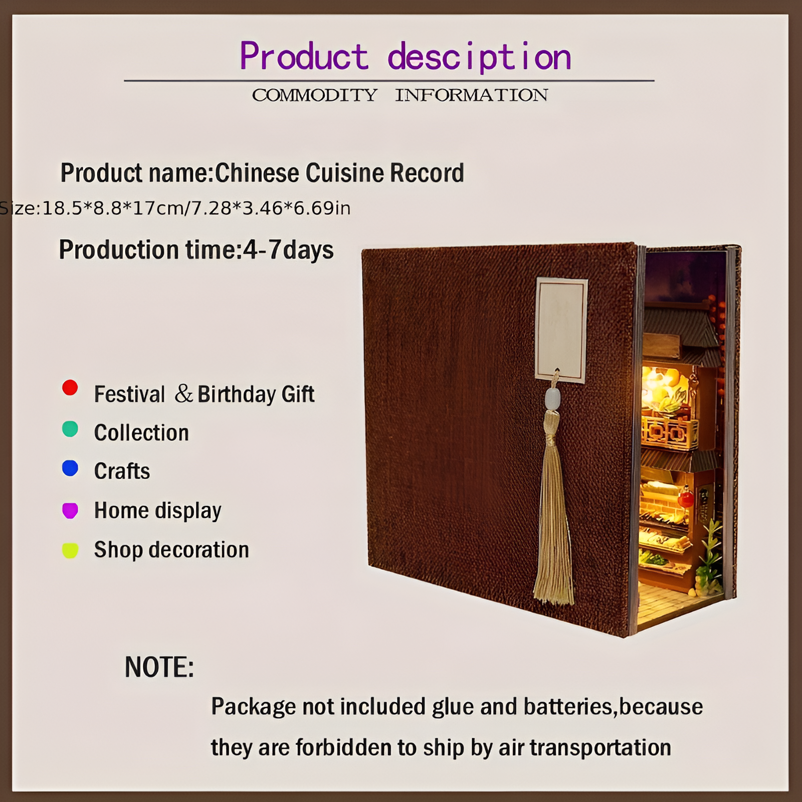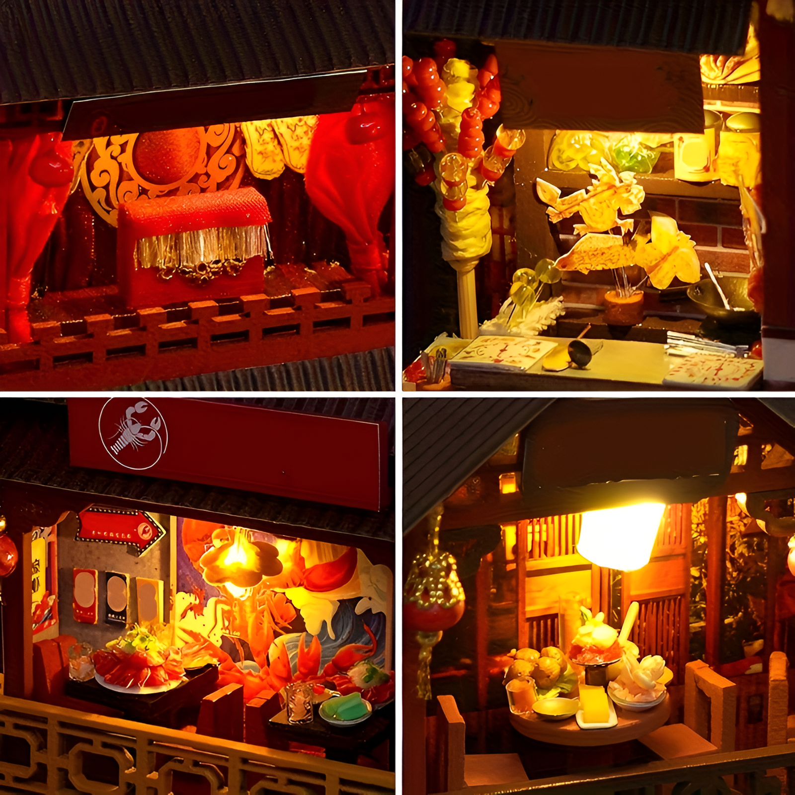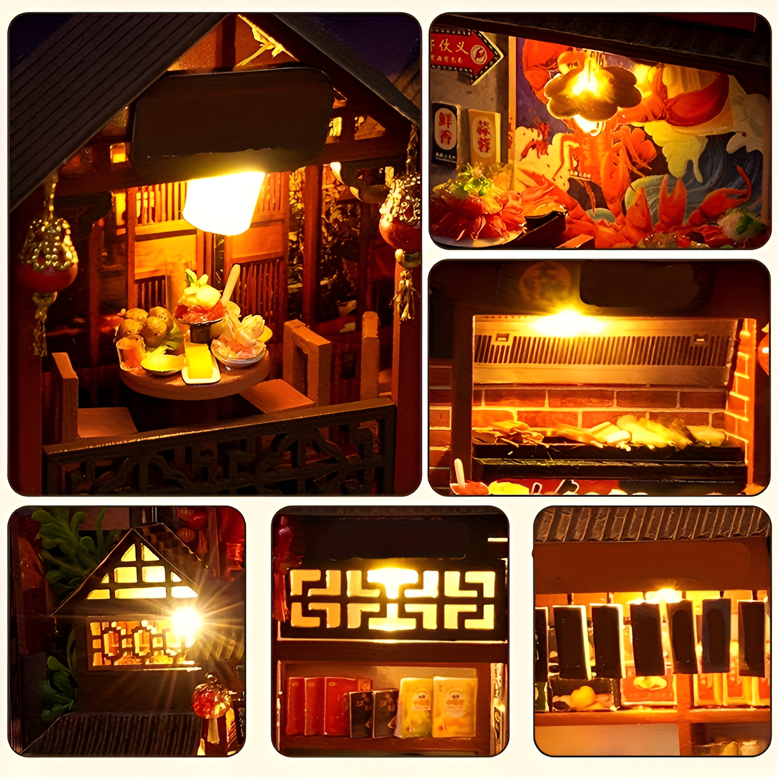 The intricate design of this miniature marketplace highlights artistic craftsmanship through detailed architecture and carefully constructed wooden puzzle components. Buildings, lanterns, and shop windows create a layered environment that adds depth and realism to the display. The folding book-style structure allows the model to open and reveal a vibrant street scene filled with miniature details. LED lighting softly illuminates the interior spaces, drawing attention to the tiny decorations and enhancing the warm ambiance of the scene. Once assembled, the model becomes a charming decorative centerpiece that adds creativity and personality to bookshelves or desks. The traditional street theme transforms everyday spaces into miniature storytelling environments inspired by historic marketplaces and cultural architecture. This DIY miniature project offers both an engaging crafting experience and a visually display suitable for collectors, hobby builders, and miniature enthusiasts.