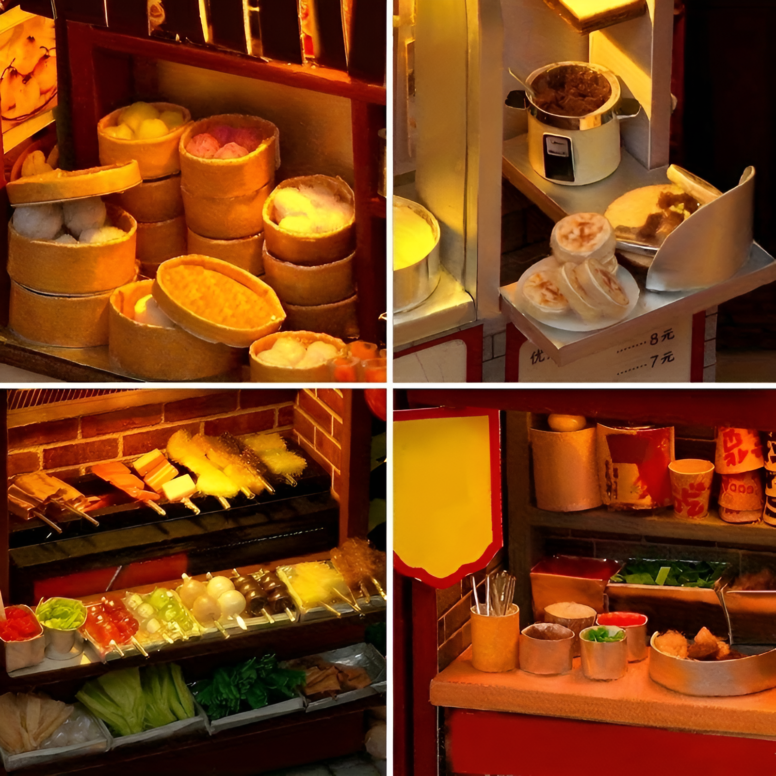 - Warm lighting creates a cozy night market atmosphere
