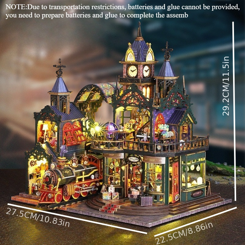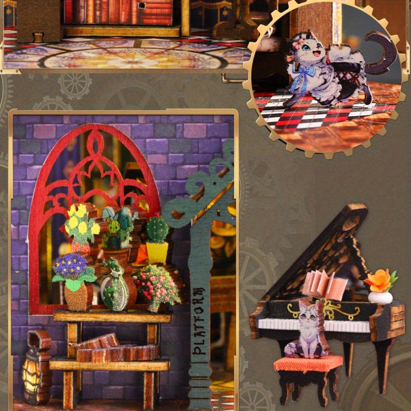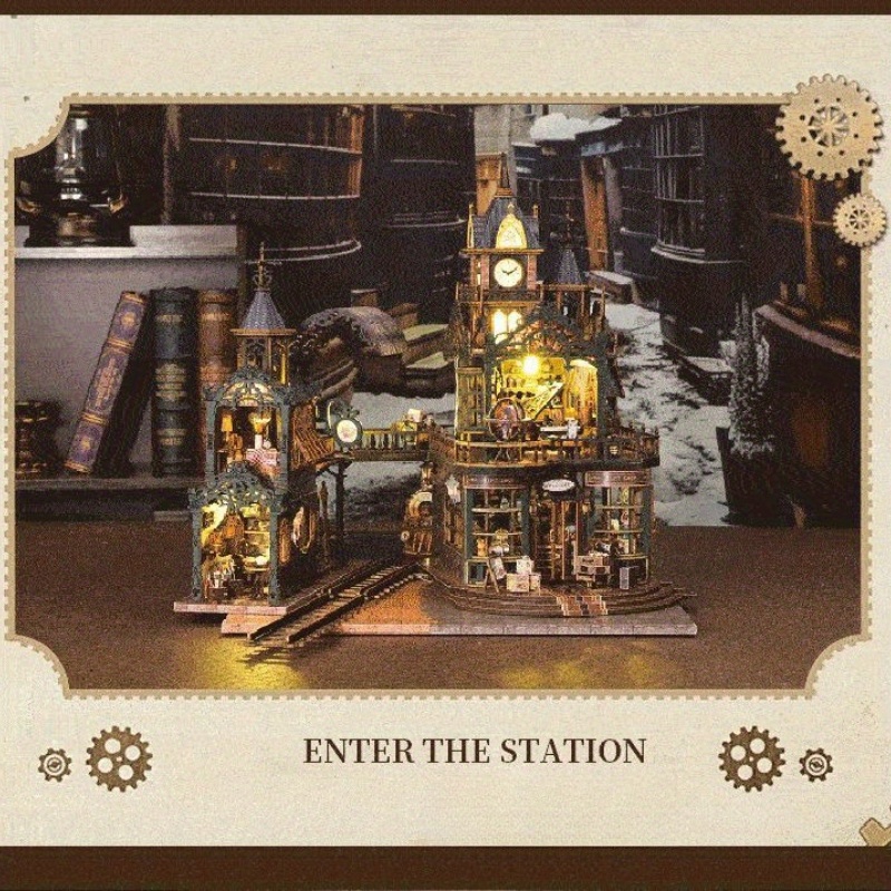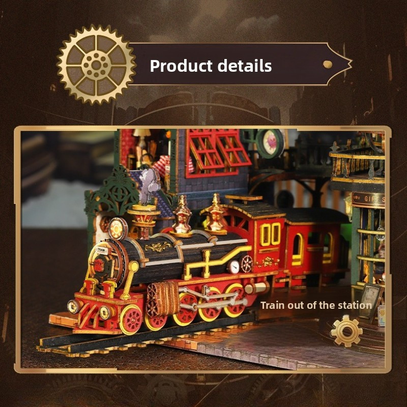 The Trajectory City Train Book Nook is a DIY puzzle assembly kit designed to create a miniature city train station environment through step by step construction. Individual components gradually form tower structures, rail sections, shop displays, and decorative architectural elements that together create a compact miniature station scene.