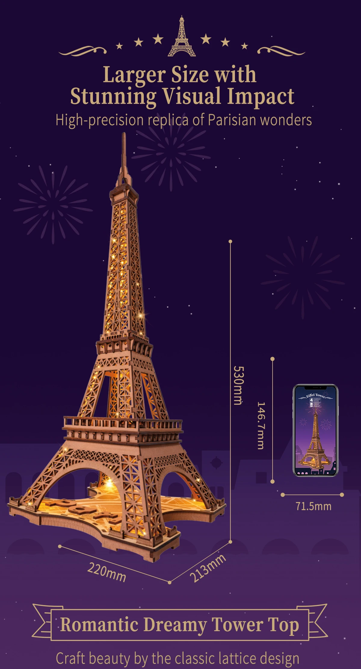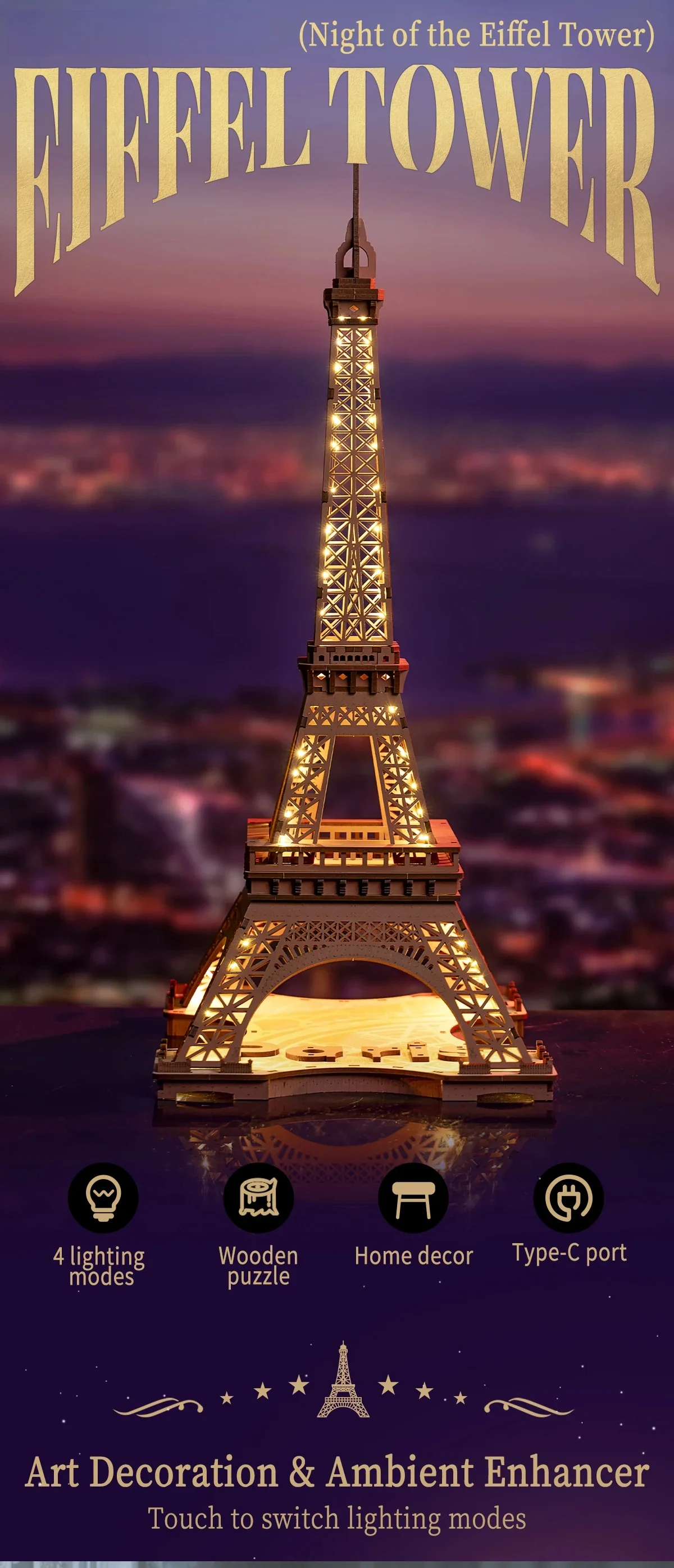 The Night Of The Eiffel Tower 3D Wooden Puzzle brings together artistry, innovation, and the spirit of Paris in one immersive project. With LED lighting, detailed wooden components, and a Type-C power system, it delivers both visual appeal and hands-on satisfaction.