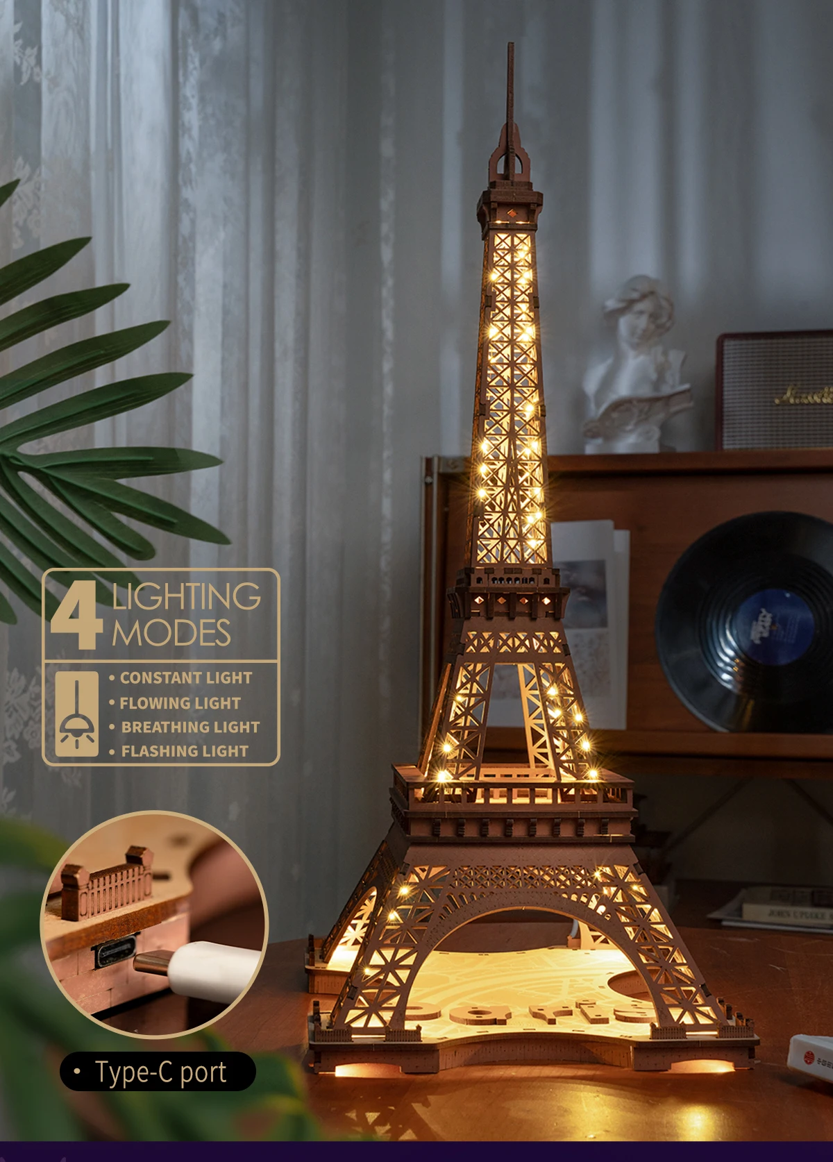 Built for creativity and ambiance, this model transforms from a construction project into an elegant decorative piece. Featuring four lighting modes, it allows you to switch between warm glow, soft illumination, or sparkling night light effects with a simple touch. The included Type-C charging port ensures easy power access for continuous display.