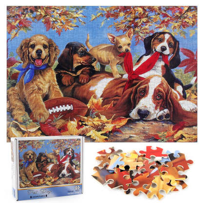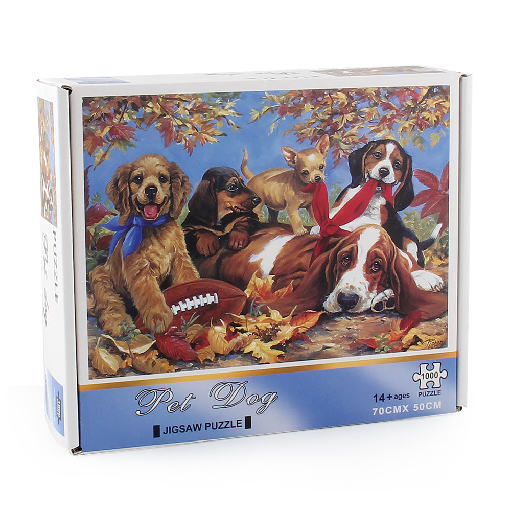 Pet Dog Wooden 1000 Piece Jigsaw Puzzle Toy For Adults and Kids is a 1000 piece wooden jigsaw puzzle designed by artist Kiaan Scott. You'll enjoy this beautiful picture of these cute dogs, having a great time with family and friends! The 1000-piece jigsaws offer an enjoyable challenge to all puzzle enthusiasts.