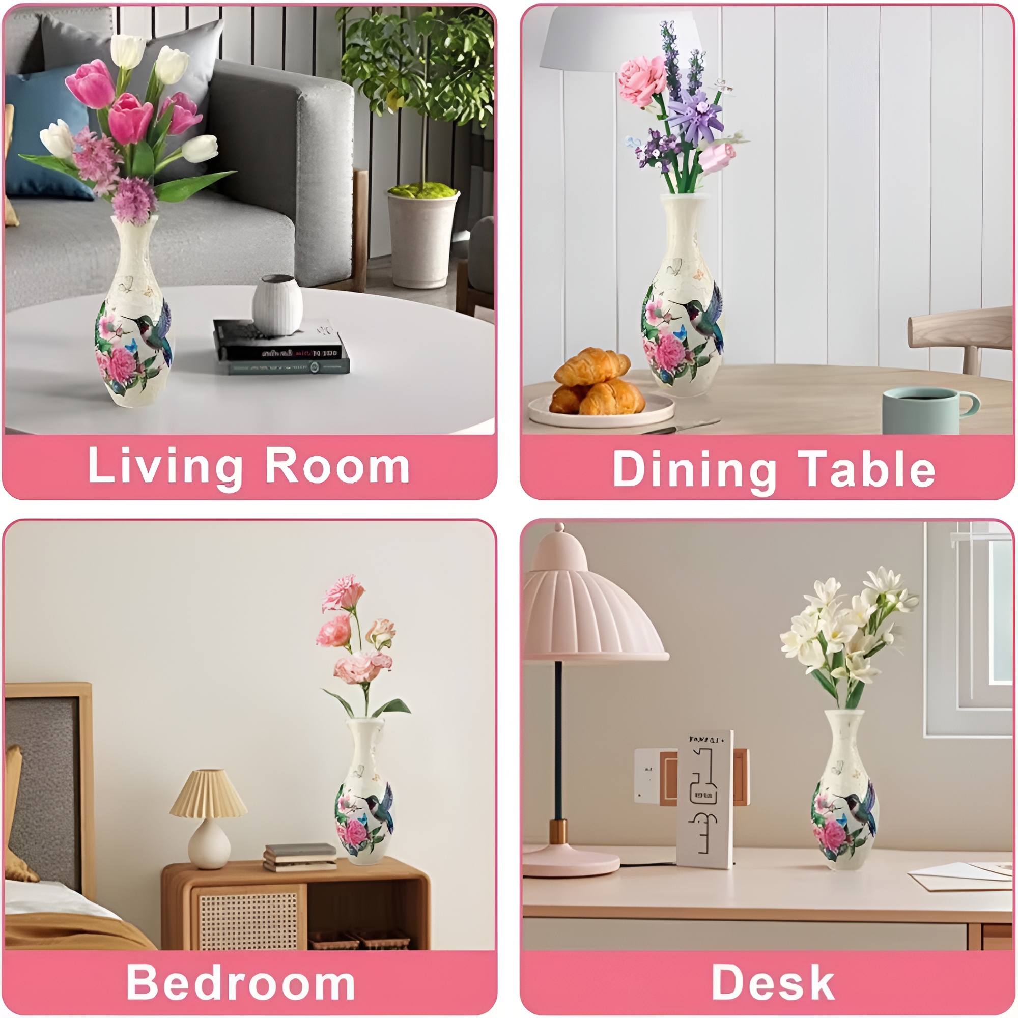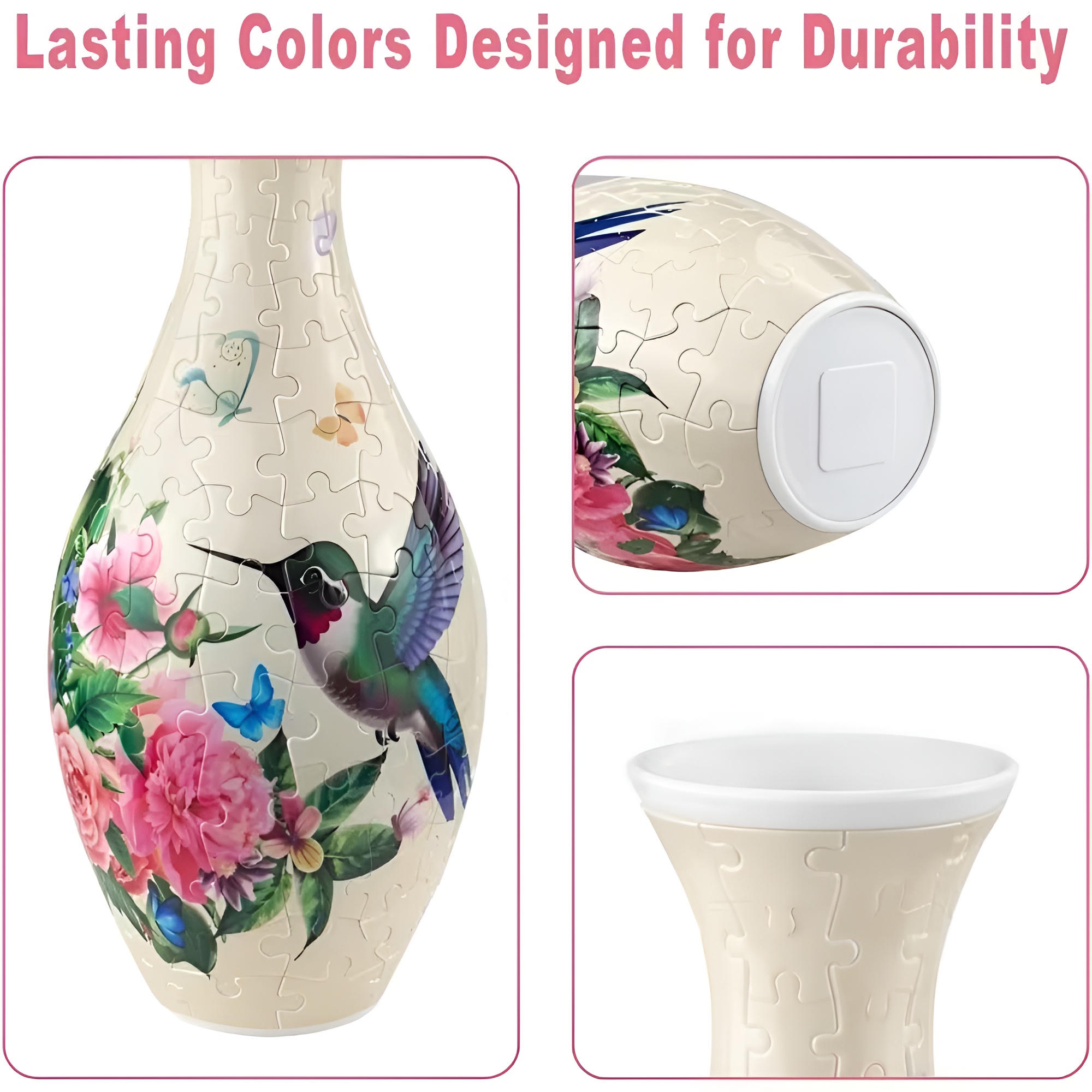 The 3D Puzzle Hummingbird Flower Decorative Vase is a puzzle assembly model designed to create a decorative vase using 160 interlocking pieces. Each piece connects to form a smooth curved structure that gradually builds the shape of the vase. Once assembled, the completed structure displays a colorful floral and hummingbird pattern across the exterior surface.