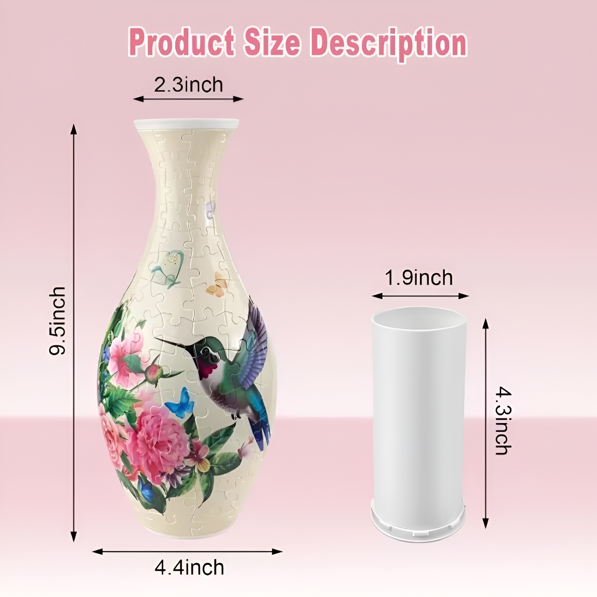 The 3D Puzzle Flower Vase is a puzzle assembly model designed to form a decorative vase structure using 160 interlocking pieces. Through step by step assembly, the puzzle components gradually create a curved vase shape decorated with a floral and hummingbird pattern.