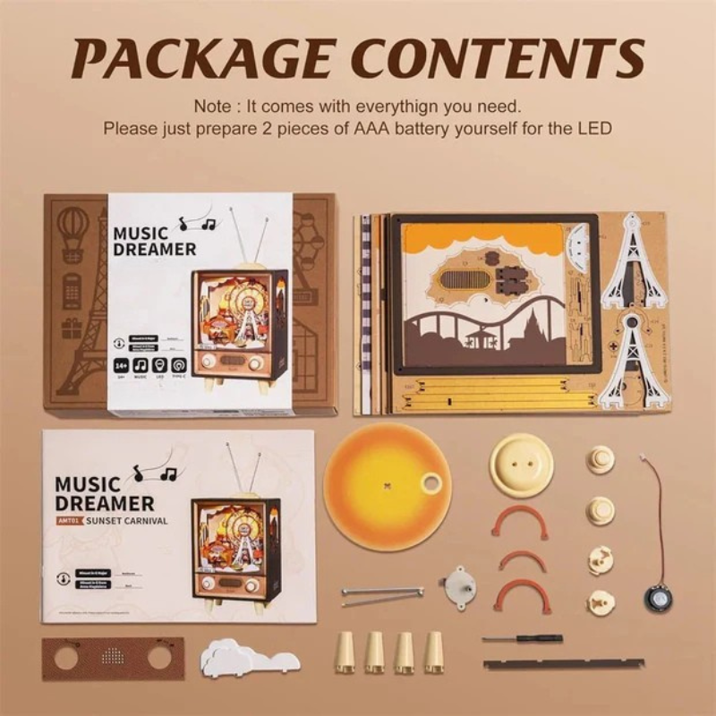 This is a Wooden Puzzle Craft kit with detailed laser-cut panels. The pieces arrive in sections that match through grooves and notches. Each step builds upon the last, forming the retro outer shape and the carnival inside.