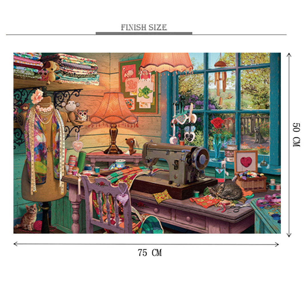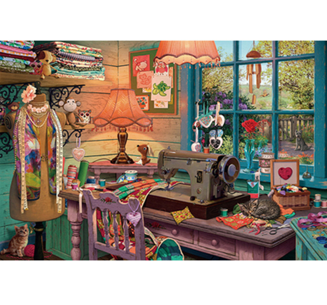 Tailor's Room is a 1000 piece wooden jigsaw puzzle designed by artist Francis Deroa. The painting represents the imaginative idea of a dreamy castle in the clouds. This is a futuristic piece designed for little scientists in your house or older kids with a flair for space and fiction. The 1000-piece jigsaws offer an enjoyable challenge to all puzzle enthusiasts
