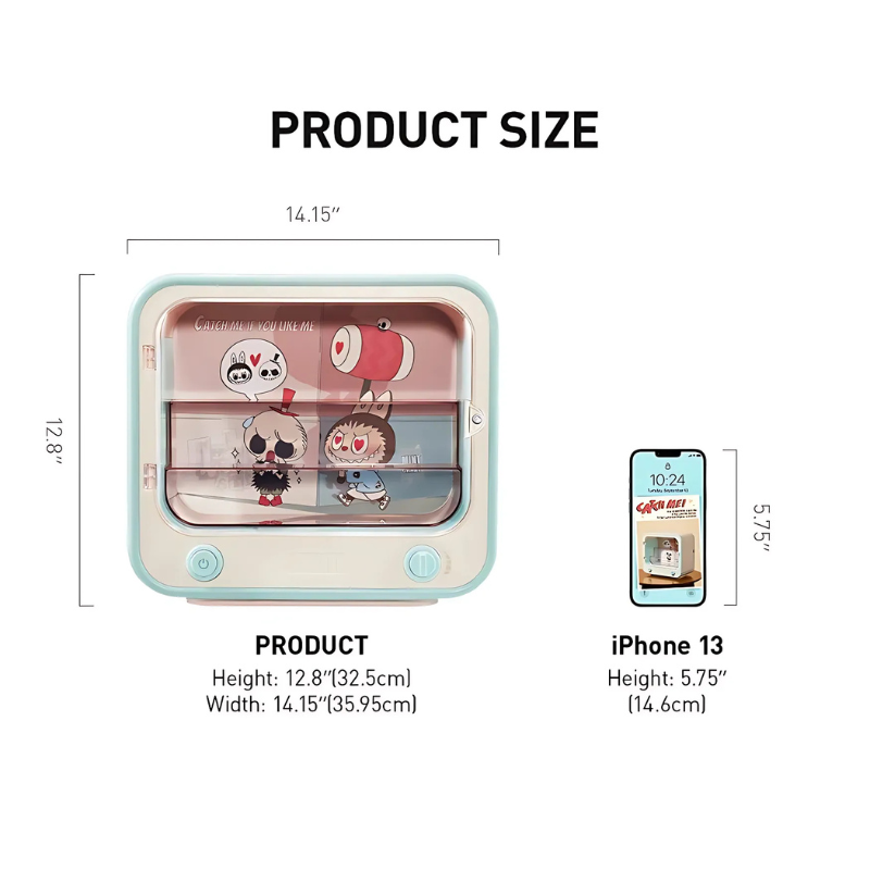 Bring playfulness and functionality together with the Labubu Luminous Display Container. Designed to look like a retro TV set, this display case showcases collectibles in a unique and engaging style. The interior lighting and artistic graphics bring each shelf to life, turning any figure into a centerpiece. Whether placed on a shelf, desk, or display cabinet, it elevates your collection with animated charm and vibrant visual appeal.