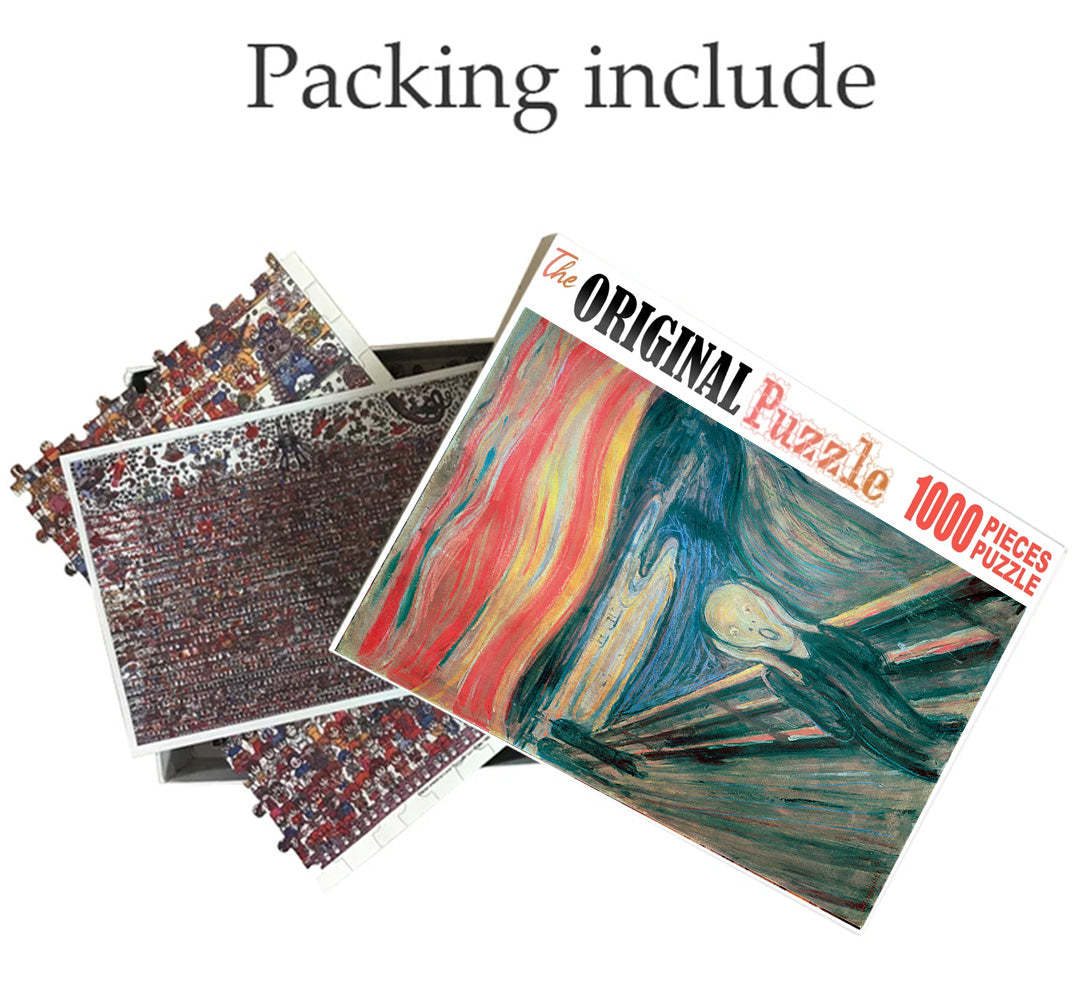 The Scream is a 1000 piece wooden jigsaw puzzle designed by artist Francis Deroa. The painting represents the imaginative idea of a dreamy castle in the clouds. This is a futuristic piece designed for little scientists in your house or older kids with a flair for space and fiction. The 1000-piece jigsaws offer an enjoyable challenge to all puzzle enthusiasts