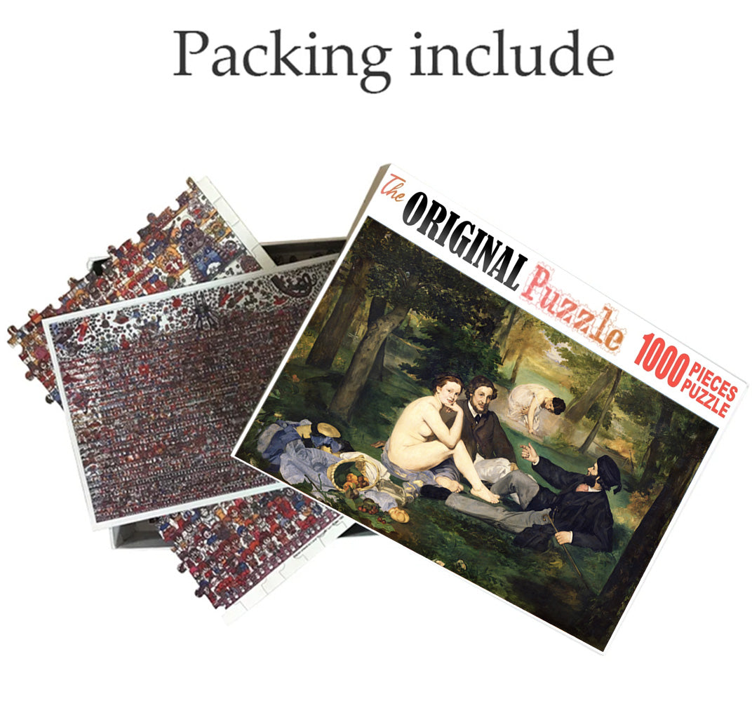 Tradesmen Picnic is a 1000 piece wooden jigsaw puzzle designed by artist Francis Deroa. The painting represents the imaginative idea of a dreamy castle in the clouds. This is a futuristic piece designed for little scientists in your house or older kids with a flair for space and fiction. The 1000-piece jigsaws offer an enjoyable challenge to all puzzle enthusiasts