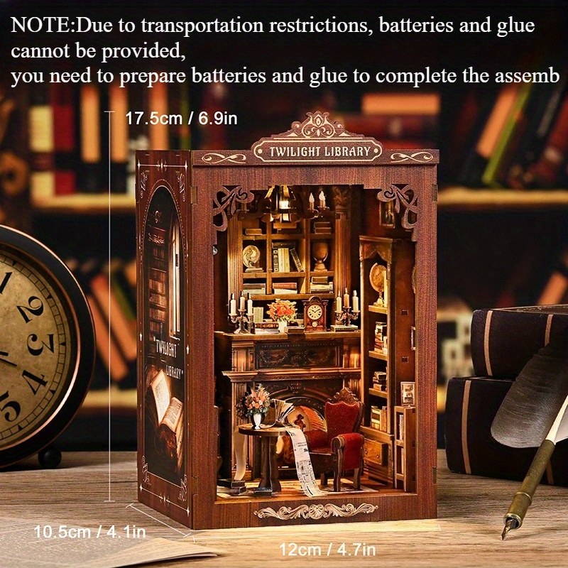 - Twilight Library Themed DIY Miniature Book Nook Display Kit includes detailed miniature furniture and library décor