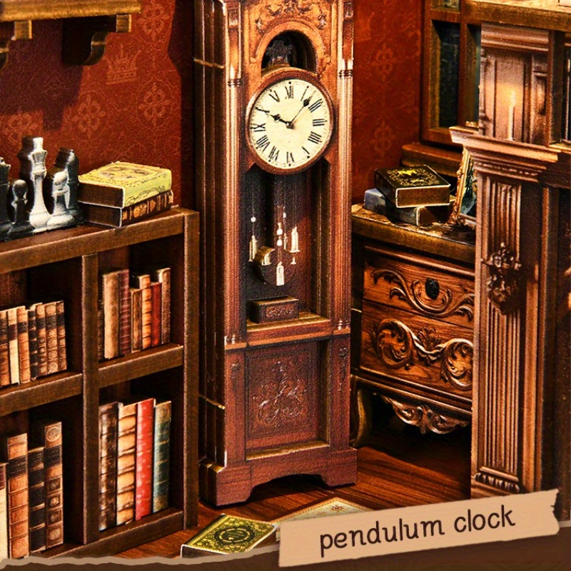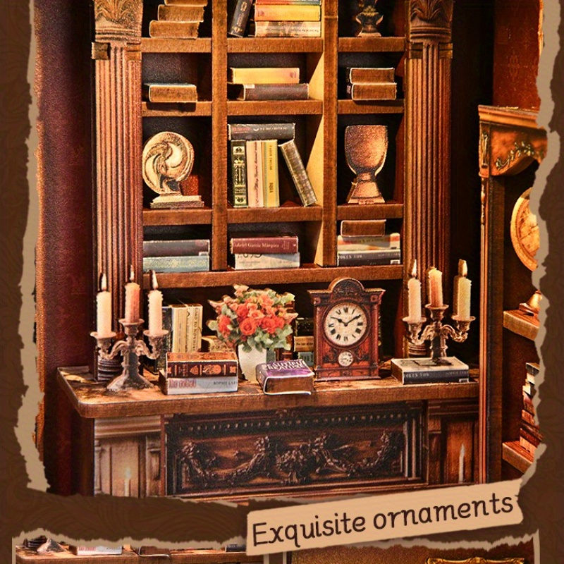 This decorative miniature kit recreates the charm of a classic reading environment with elegant architectural details and carefully crafted accessories. The wooden construction provides durability while maintaining a timeless aesthetic that blends beautifully with bookshelves or display areas. During assembly, each element gradually forms a layered miniature scene that resembles a cozy library filled with decorative furniture and tiny books. The warm lighting effect enhances the visual depth and highlights the intricate craftsmanship of the miniature environment. After completion, the display becomes a captivating decorative feature that transforms ordinary shelving into a creative visual experience. Its detailed design and miniature architecture add artistic character to reading spaces, hobby collections, and decorative interiors. This creative project offers both an engaging building process and a visually finished display.