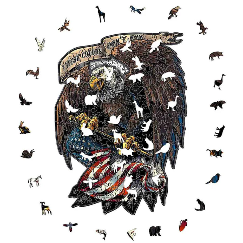Celebrate the spirit of patriotism with this eagle-themed wooden jigsaw puzzle, a tribute to enduring values and national pride. Featuring a stunning eagle design clutching an American flag, this puzzle blends artistry and precision craftsmanship. Great for puzzle enthusiasts and those who appreciate meaningful artwork, it offers a satisfying challenge and doubles as a decorative piece.