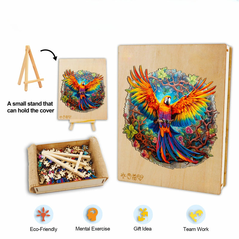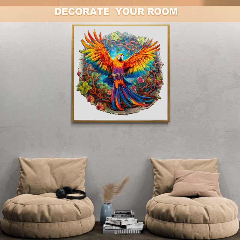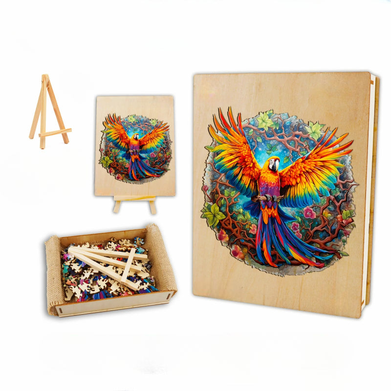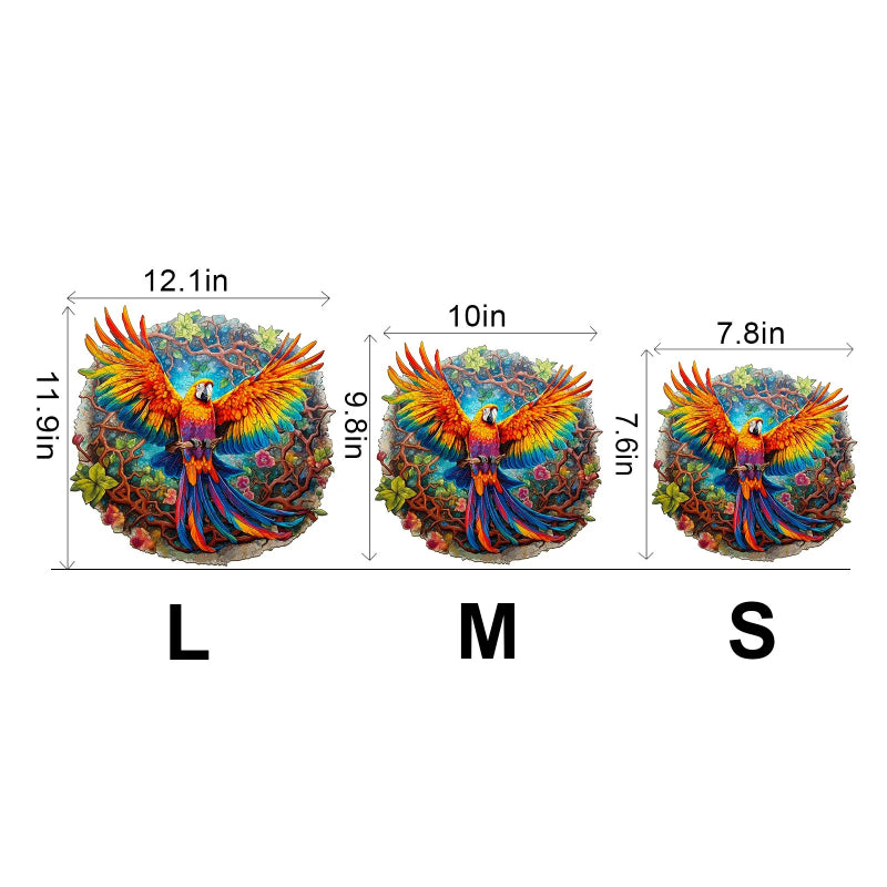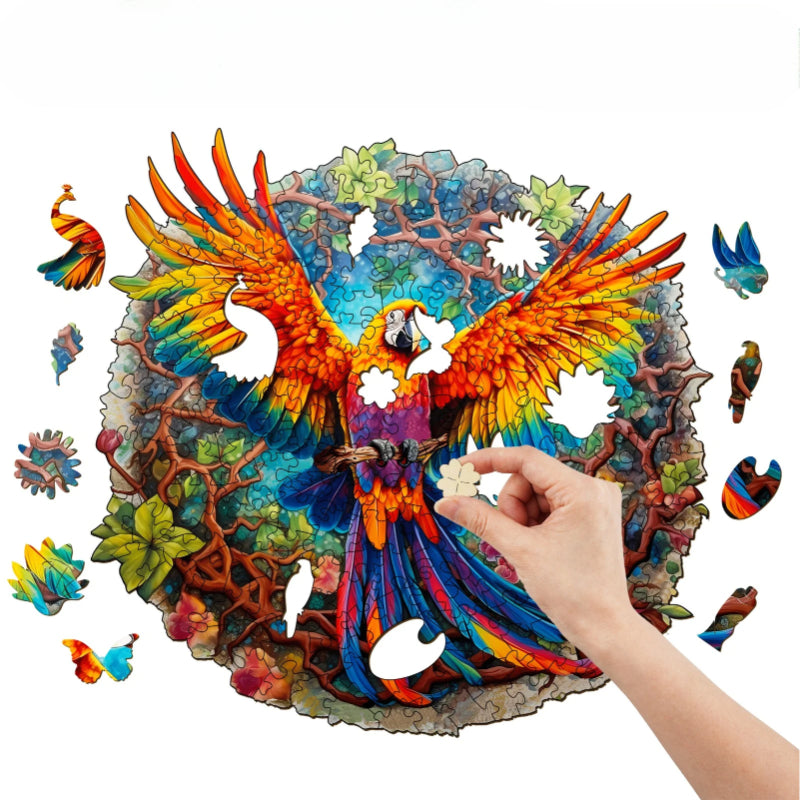 This Wooden Parrot Jigsaw Puzzle captures the essence of a rainforest with its vibrant, life-sized portrayal of a parrot in flight. The puzzle is designed with interlocking pieces that are each a work of art, cut to mimic the forms of the parrot and the surrounding foliage. Crafted from premium wood, the puzzle pieces fit together to form a round, full image of the parrot with a backdrop rich in flora.