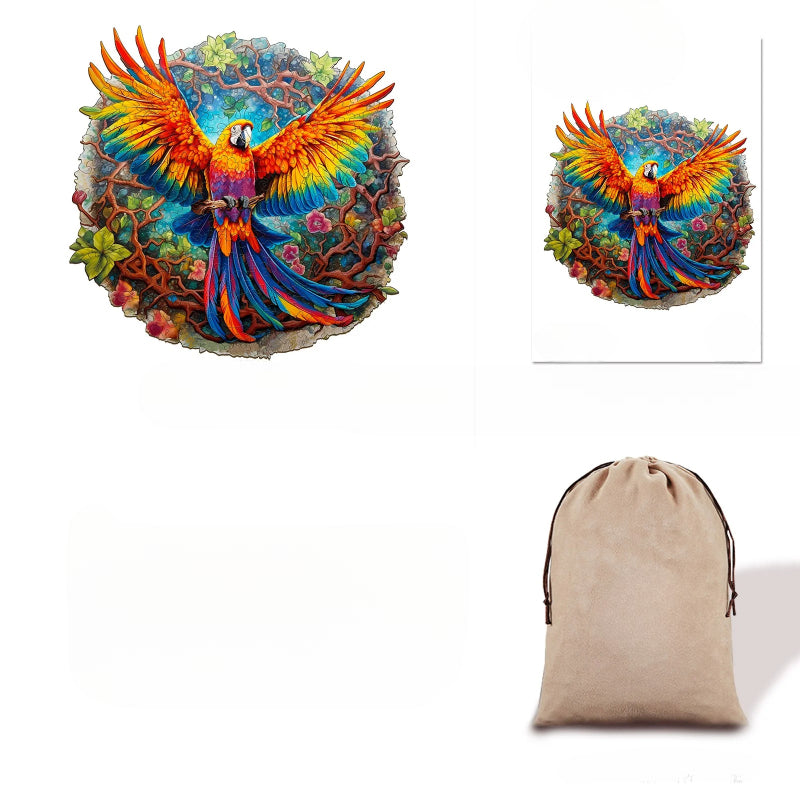 Pattern: The puzzle, when completed, reveals a vivid illustration of a parrot in mid-flight, with a kaleidoscope of colors that bring the image to life.