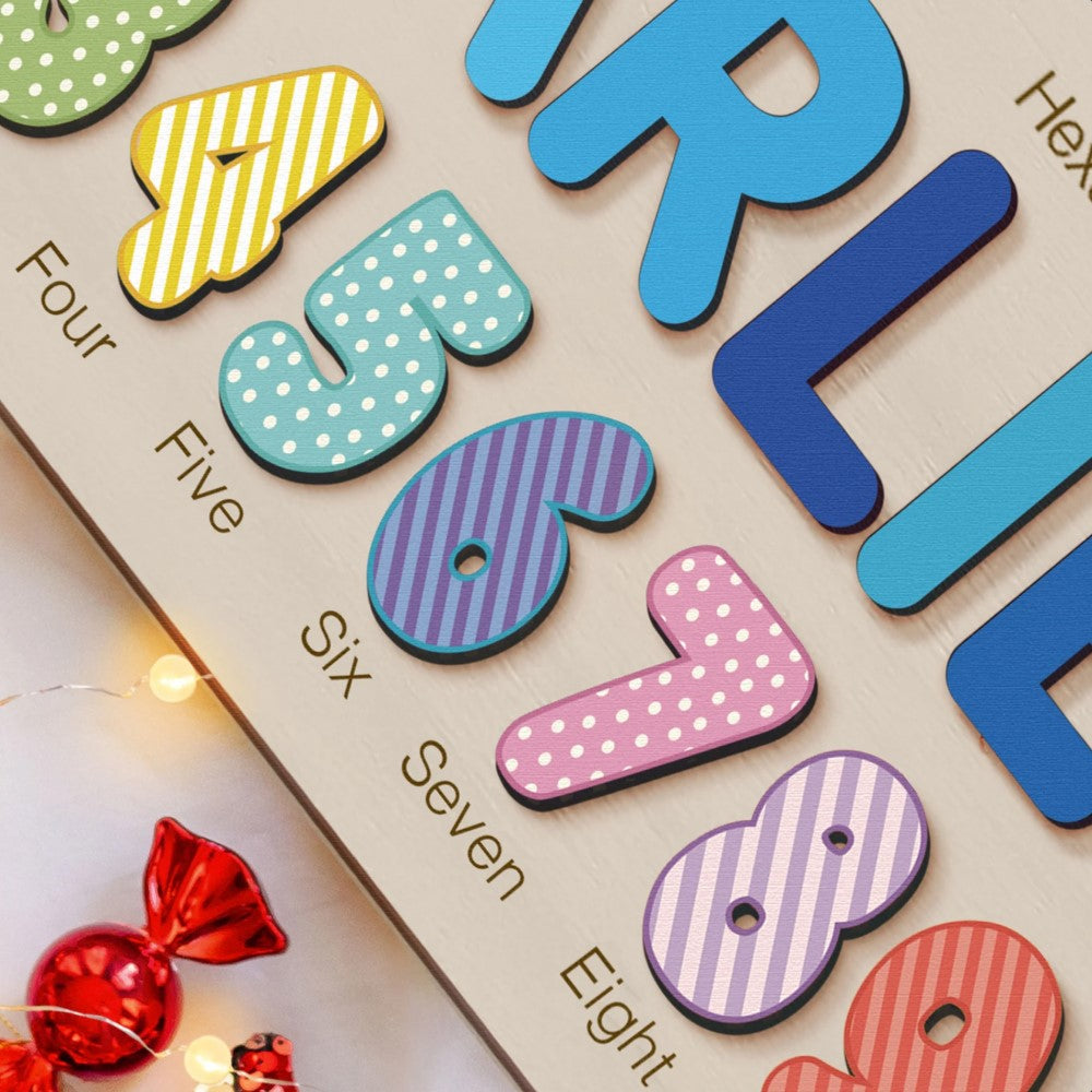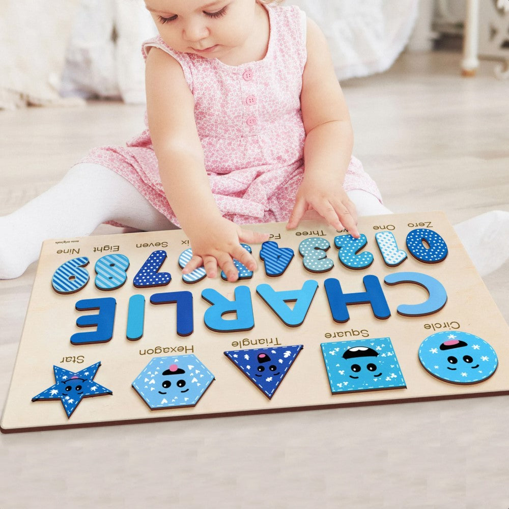 This Custom Interactive Shape And Number Wood Puzzle is not just a toy, but a fun learning experience for children. The puzzle features the name "Charlie" in large blue letters, providing a sense of ownership and personalization. Accompanied by vibrant shapes with cheerful facial expressions, it introduces basic geometric shapes alongside numbers 0 through 9. Each number and shape is backed with a small knob, perfect for little hands to grasp and manipulate, enhancing coordination and cognitive skills.