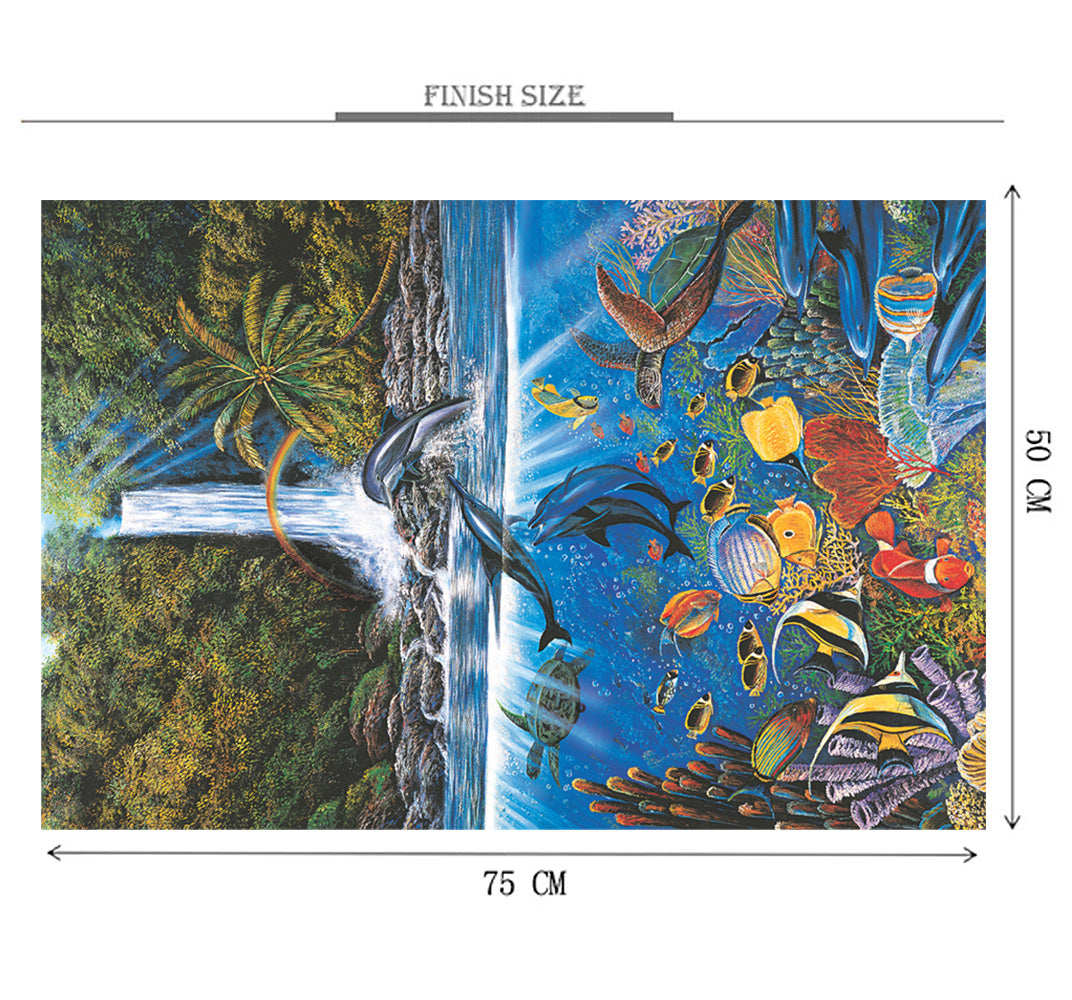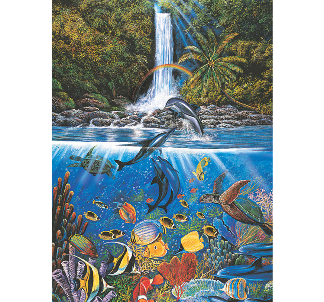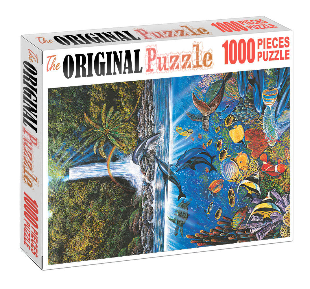 Jungle Dolphin 1000 piece wooden jigsaw puzzle is a fun illustration of sea animals in the jungle swimming with a beautiful waterfall behind them.