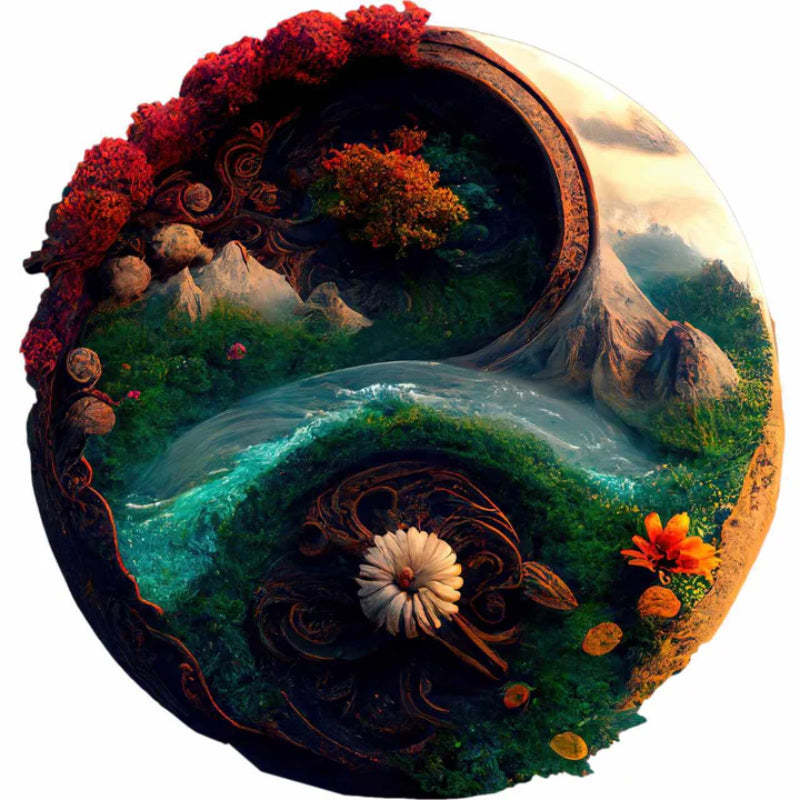 Immerse in the beauty of nature with this intricately designed Nature Yin-Yang Wooden Jigsaw Puzzle. This stunning piece combines artistry and craftsmanship, showcasing a landscape of mountains, rivers, forests, and flowers in a harmonious yin-yang layout. Ideal for puzzle enthusiasts and nature lovers, this wooden puzzle is both a captivating activity and a striking decorative piece when completed.